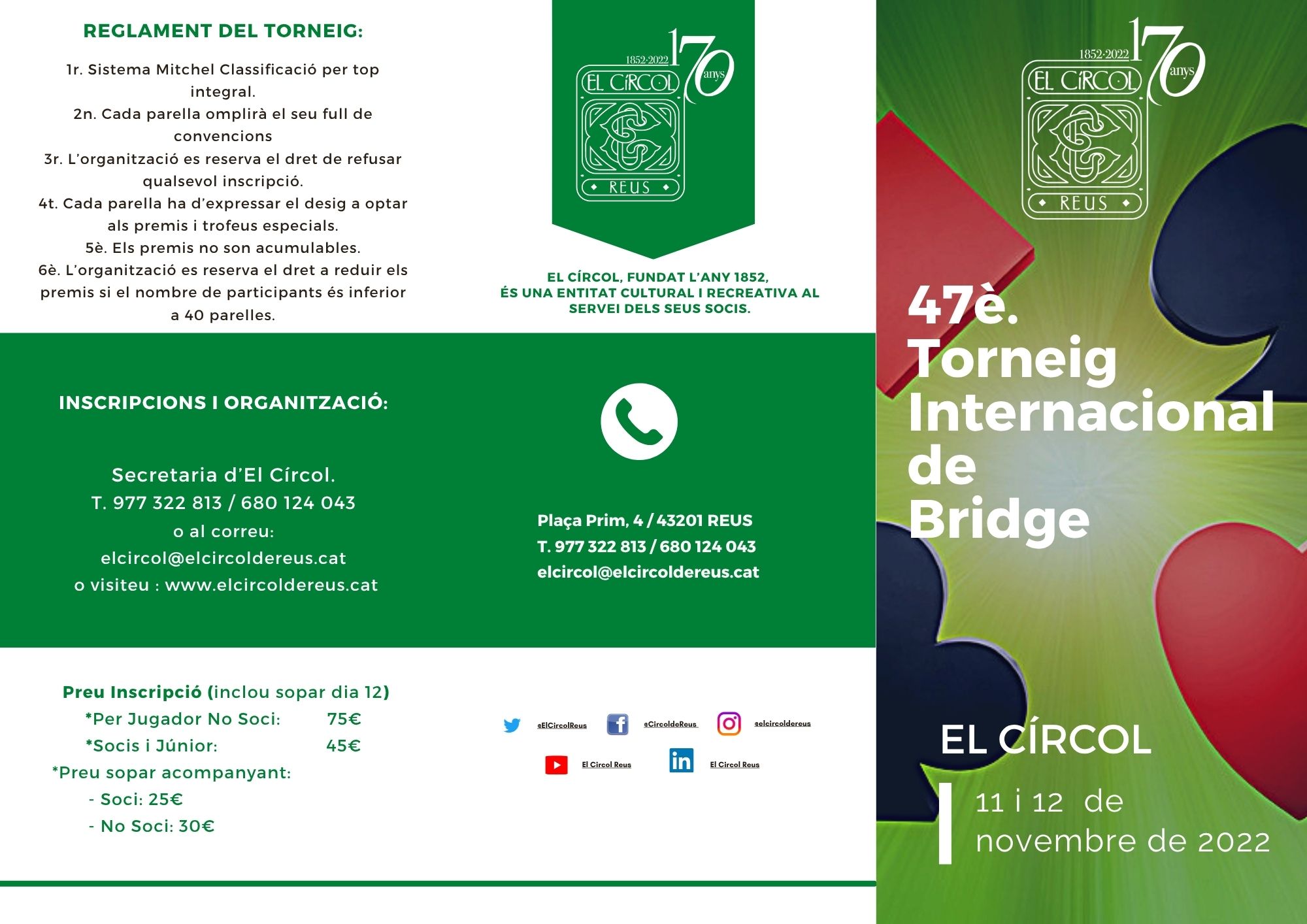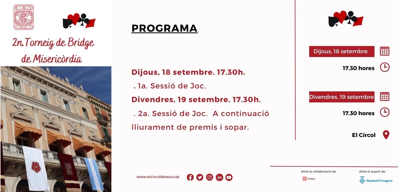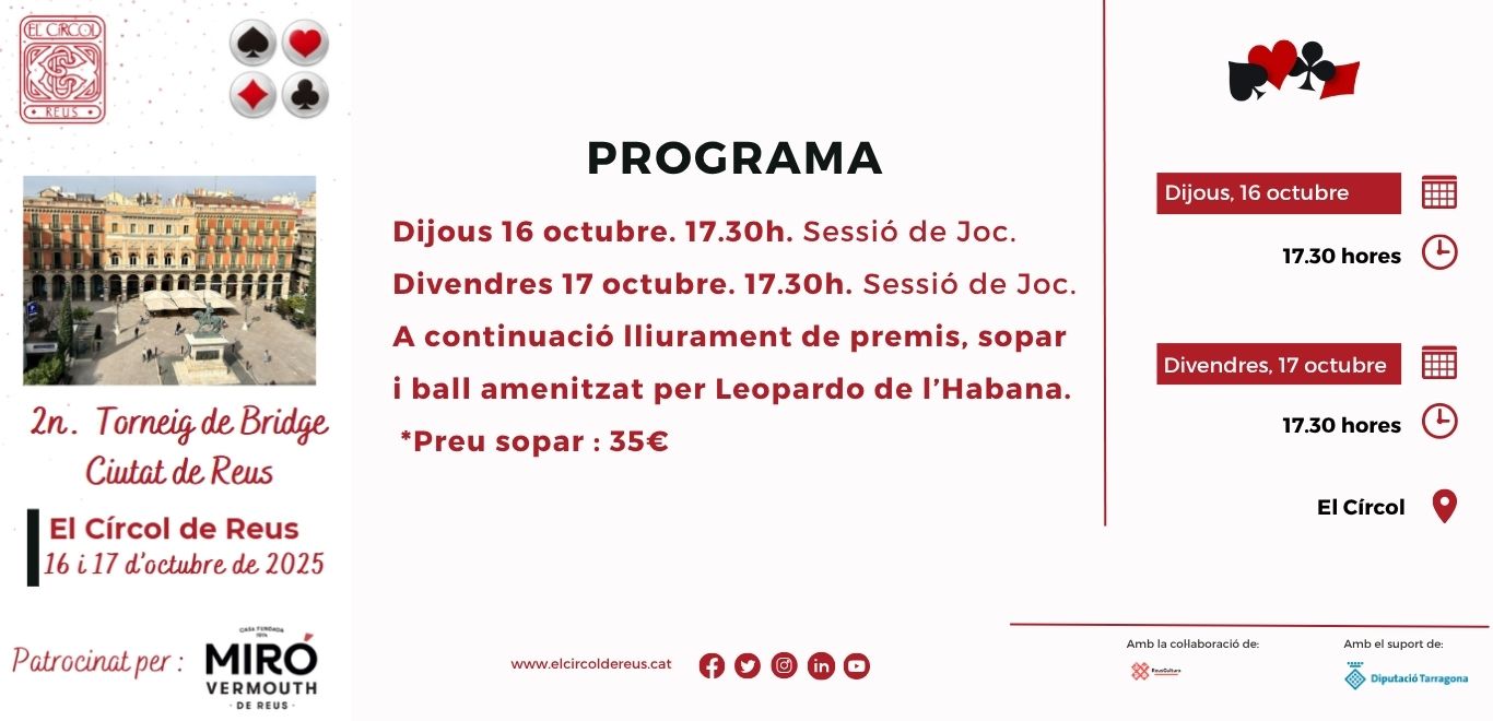 Data set. 18 - 19, 2025Temps 5:30 pm - 9:30 pmLloc El Círcol de ReusOrganitza El Círcol de ReusCategoria Bridge Més info