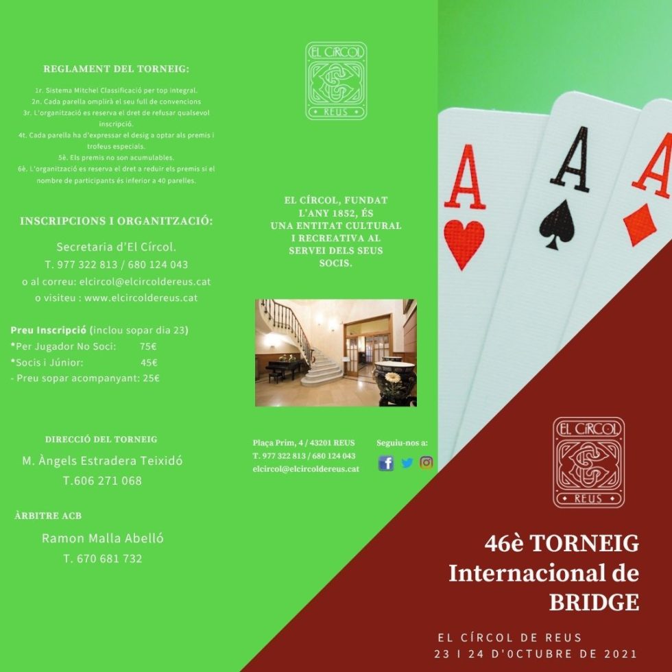 Data oct. 23 - 24, 2021Temps 6:00 pm - 8:00 pmLloc El Círcol de ReusOrganitza El Círcol de ReusCategoria Bridge Més info