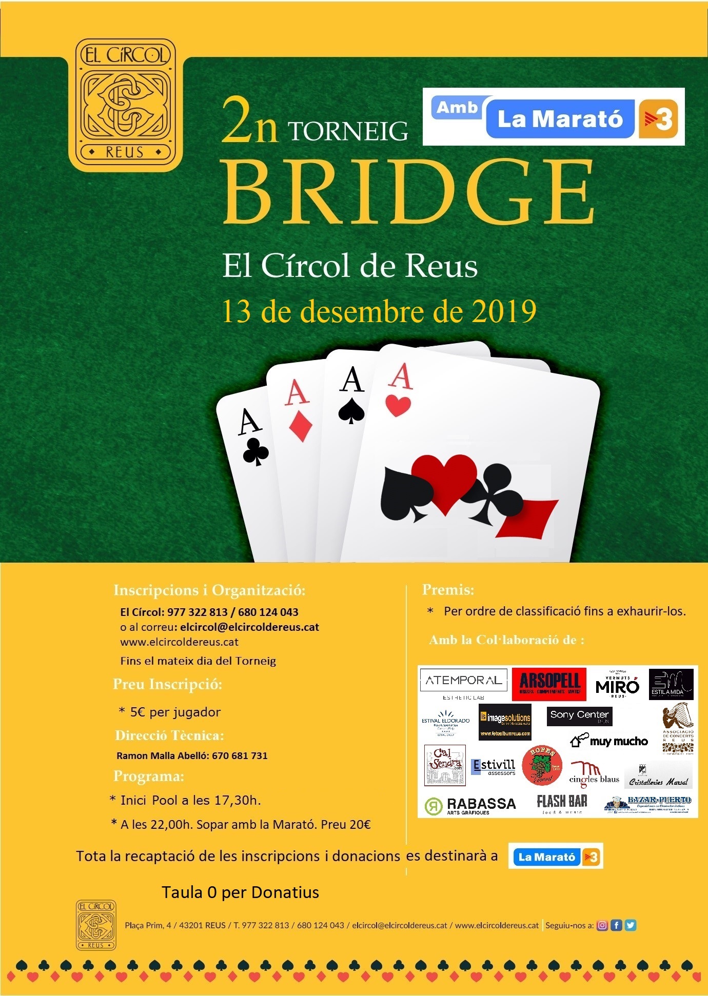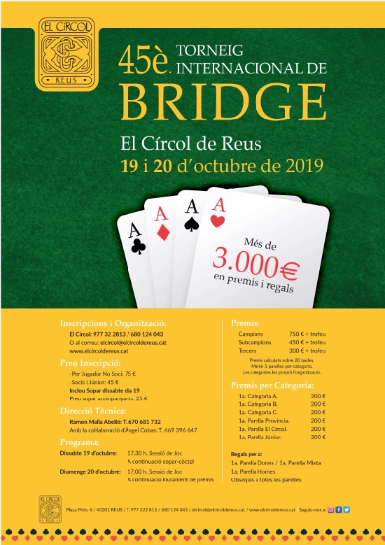 Data oct. 19 - 20, 2019Temps 6:00 pm - 8:00 pmLloc El Círcol de ReusOrganitza El Círcol de ReusCategoria Bridge Més info