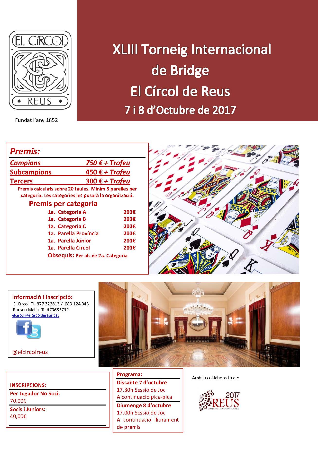 Data oct. 7 - 8, 2017Temps 6:00 pm - 8:00 pmLloc El Círcol de ReusOrganitza El Círcol de ReusCategoria Bridge Més info