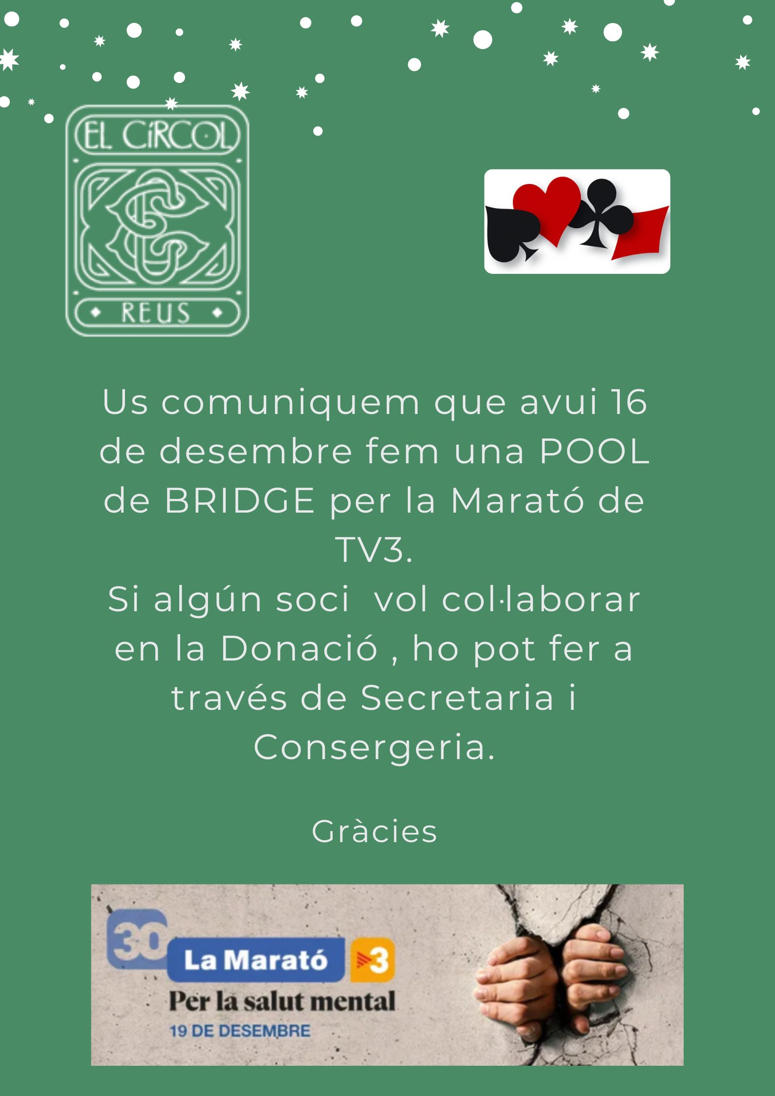 Data desembre 16, 2021Temps 6:00 pm - 9:00 pmLloc El Círcol de ReusOrganitza El Círcol de ReusCategoria Bridge Més info