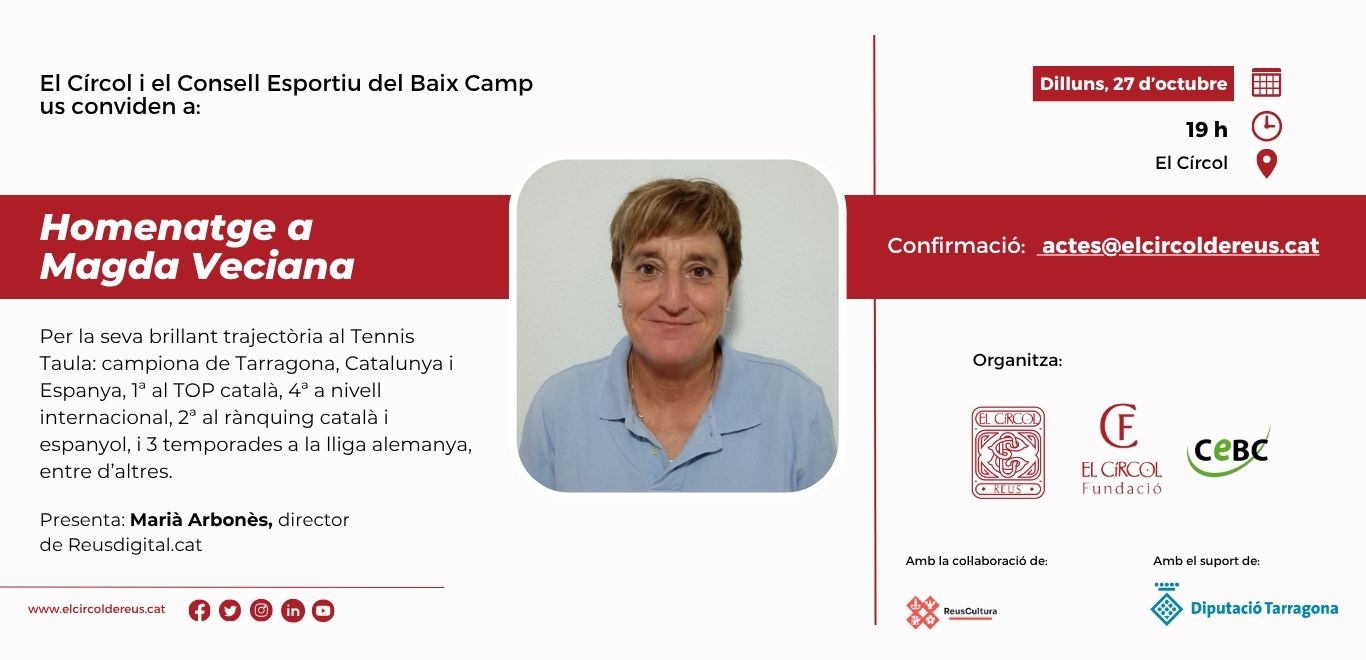 El Círcol i el Consell Esportiu del Baix Camp us conviden a: "Homenatge a Magda Veciana". Per la seva brillant trajectòria al Tennis Taula: campiona de Tarragona, Catalunya i Espanya, 1ª al TOP català, 4ª a nivell internacional, 2ª al rànquing català i espanyol, i 3 temporades a la lliga alemanya, entre d’altres. Presenta l'acte: Marià […]